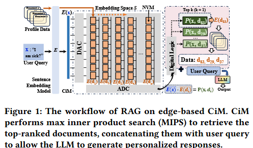 在基于 CiM 部署 RAG 时,首先需将嵌入向量存储到 NVM 中(如图 1 所示)。这些嵌入向量由句子嵌入模型生成,是文档数据的数值表征 —— 文档数据中的每个文档对应一个向量,存储在 NVM 上的嵌入向量会组成如图 1 中橙色块所示的矩阵。当用户查询被转换为嵌入向量后,CiM 可通过向量 - 矩阵乘法,同时对该用户查询嵌入与所有文档嵌入执行 MIPS 运算;内积结果中排名靠前的值将作为索引,用于检索对应的文档数据(如图 1 中粉色块所示),而检索到的用户相关文档即为 MIPS 的输出结果。