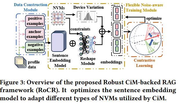 如图 3 所示,本文提出的鲁棒性内存计算驱动型 RAG 框架(RoCR)包含三个部分:首先,通过对比学习利用训练数据优化训练模块;为了实现上述训练,我们需要基于文档数据构建对比训练数据对,并将其输入灵活的噪声感知训练模块;最后,通过性能分析获取 CiM 中非易失性内存(NVM)的约束条件,将这些约束编码到灵活的噪声感知训练模块中,用于训练句子嵌入模型 —— 最终使该模型生成的嵌入向量能够抵御目标 NVM 器件的变异影响,训练完成后,训练模块可转化为新的句子嵌入模型,生成适配 CiM 架构的嵌入向量。