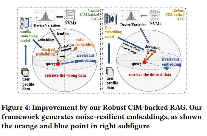 然而,正如 2.1 节所述,将文档嵌入写入 NVM 会使其受时间变异(器件变异)的影响,导致 NVM 中存储的嵌入向量与句子嵌入模型生成的原始嵌入向量存在差异。如图 4 的左边所示,基础嵌入模型生成的目标嵌入向量会在器件变异下偏离为含噪声的嵌入向量,使得不相关的嵌入向量因内积值更大,排名超过目标嵌入向量。