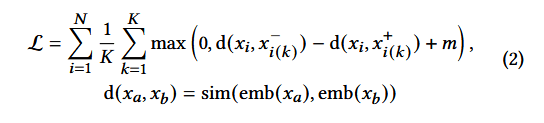 距离d(xa,xb)是通过两个数据的嵌入向量emb(xa)与emb(xb)之间的欧氏距离计算得到的。而函数sim()的作用是计算语义相似度。m是一个超参数,目的是让正样本对更近、负样本对更远,但如果设的太大,就会导致训练困难、容易过拟合。