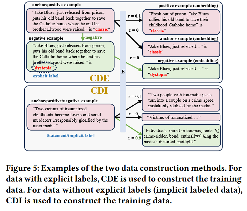要通过对比学习训练句子嵌入模型,构建正例与负例区分度明确的样本对至关重要。在本研究中,由于我们采用的是三元组对比损失而非样本对损失,因此会构建包含锚点样本、正例样本与负例样本的三元组样本。我们利用文档数据来构建这类三元组样本,而文档数据是在用户与大语言模型的交互过程中生成的,其中包含用户偏好信息。这类数据存在两种情况:一是文档数据可能包含显式标签,用于标识用户对对应内容的偏好响应;二是文档数据也可能是仅包含用户相关信息但无显式用户偏好的语句。如图 5 所示,为应对这两种情况,我们提出了两种数据构建方法:带显式标签的数据构建法(CDE)与带隐式标签的数据构建法(CDI)。