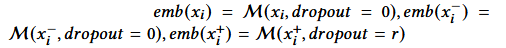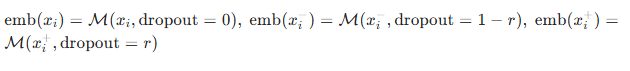 然后,嵌入向量的生成过程会根据嵌入模型M中应用的丢弃率而变化。当使用模型M生成锚点与负例的嵌入向量时,丢弃率被设为 0;与之相反,生成正例的嵌入向量时,会启用丢弃率r。因此,锚点、负例、正例的嵌入向量(如图 5 所示)可构建为: