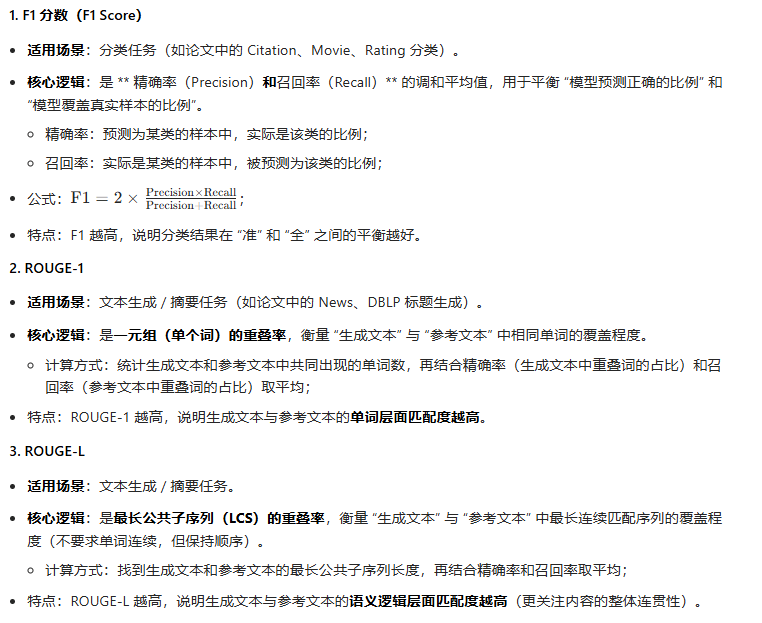 对于 News 和 DBLP 数据集,其标签为句子,这类数据集用于验证文本生成能力。我们使用ROUGE-1和ROUGE-L评估生成文本与参考文本之间的重叠度:ROUGE-1 捕捉单个词的精确率与召回率,ROUGE-L 捕捉最长匹配序列,以此全面评估文本生成质量。