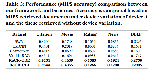 如表 3 所示,在五个数据集上,采用两种数据构建方法的我们的框架,性能均优于四个基准方法。这表明我们的框架能够缓解器件变异导致的嵌入向量扰动。这些结果也与图 2 中的初步研究结论一致:在朴素高斯噪声中,σ 的增大会损害 MIPS 的性能。