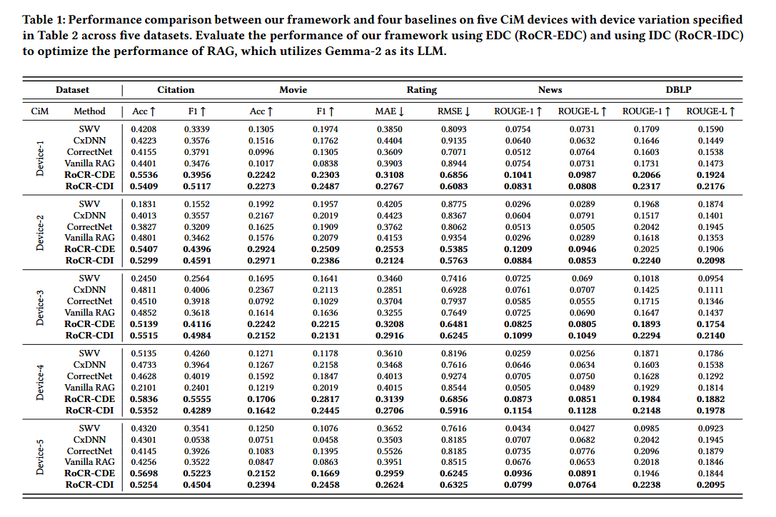 我们在五种 CiM 器件上对五个数据集的 RAG 性能进行了验证,这些器件的变异参数已在表 2 中列出。如表 1 所示,在相同数据集下,各类器件变异均会显著降低 RAG 的鲁棒性,而我们的框架能够有效缓解不同类型的器件变异带来的影响。例如,在 Device-2 上,Citation 数据集的 RAG 性能波动区间为 0.18 至 0.48,而我们的框架可将该数据集在所有五种器件上的准确率提升至 0.5 以上。相比之下,四个基准方法的性能均明显低于理想水平,而我们的框架通过生成更优质的句子嵌入向量,性能不仅显著逼近理想水平,部分场景下甚至实现了超越。这是因为我们提出的鲁棒性内存计算驱动型 RAG 框架(RoCR)同时具备正则化作用,可提升模型的泛化能力。