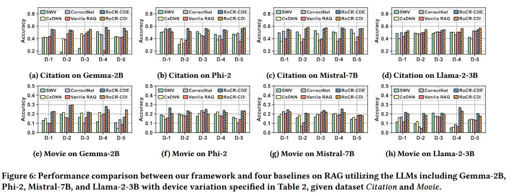 此外,我们还评估了不同大语言模型对框架性能的影响。如图 1 所示,大语言模型的输入为 MIPS 检索到的数据与用户查询语句的拼接结果,并据此生成针对用户查询的回复。由于面对相同查询时,不同大语言模型生成的回复可能存在差异,因此我们在实验中选取了四款当前主流的、适用于边缘端的中等规模大语言模型,以验证框架性能。其中,Gemma-2B 是谷歌推出的一款全新的最优开源模型,模型权重为 4.95G;据谷歌官方介绍,该模型的性能优于同类型模型。我们同时选取了 Meta 推出的首批开源大语言模型之一 ——Llama2-3B ,其模型权重为 6.85G;微软发布的 Phi-2 ,这是一款性能强大的小型大语言模型,权重为 5G;以及继 Llama 系列之后表现出色的 Mistral AI 模型 ——Mistral7B-GPTQ 。实验选取 Citation 和 Movie 两个数据集,采用默认实验配置,设置器件变异参数 σ=0.1,并以 CiM Device-1 为实验环境,结果如图 6 所示。可以清晰地看到,在五种 CiM 器件上,我们的框架性能均优于所有基准方法;此外,各基准方法在同一数据集上的性能会因器件不同而产生较大波动,而我们的框架则能够实现更稳定、更鲁棒的性能表现。