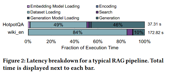 为挖掘潜在性能开销组成,我们量化了各阶段对 RAG 流水线端到端延迟的占比贡献。图 2 展示了 RAG 流水线中各类操作对端到端执行时间的占比情况,核心结论有二:其一,数据集加载耗时占流水线总延迟的比重极大;其二,数据集加载延迟的占比随数据集规模扩大而提升。注意,这个“数据集加载”指的是RAG 检索前,把 SSD 里的全量嵌入向量数据库(包含关联的文档),通过 PCIe 总线全量读到主机内存 / 计算单元的 I/O 操作。由此我们得出结论:检索阶段的数据集加载为 RAG 流水线带来了显著延迟,成为性能瓶颈,在大规模数据集场景下尤为突出。我们将该瓶颈定义为RAG 流水线的 I/O 数据移动瓶颈。