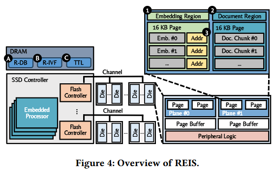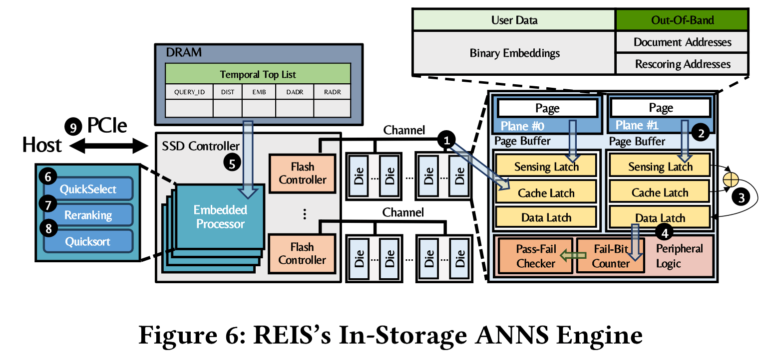 数据库布局通过分离高频访问的嵌入向量与低频访问的文档块提升性能,但文档检索需建立二者的关联映射。为此,REIS 在存储系统内设计了一种低成本关联机制,将每个嵌入向量与其对应文档块的物理地址绑定。现代 NAND 闪存会为每一页预留专属存储空间用于存放 ECC 校验位,该区域称为带外区(OOB)(例如,每 16KB 物理页配备 2208 字节空闲空间 ),闪存页缓冲在读取数据页时,会同步加载带外区数据。REIS 复用带外区的少量空间,存储每个嵌入向量对应的文档块物理地址(图 4 中③)。该机制确保嵌入向量加载至页缓冲时,其关联文档块的地址也同步完成加载,因此当存储系统对整页嵌入向量执行距离计算时,页缓冲中已留存关联文档块的地址,可直接用于文档的定位与检索。该关联机制无需为文档检索维护专用数据结构,仅为存储系统带来极低的空间开销。