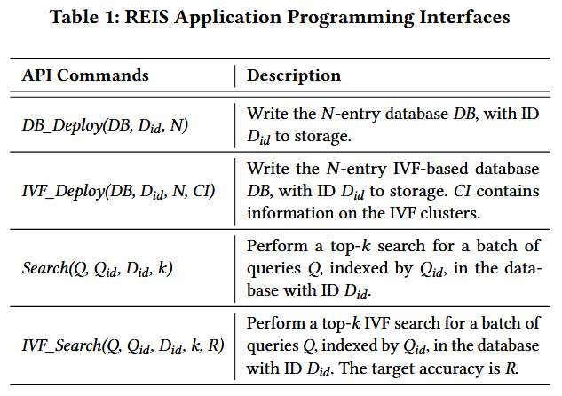 在检索阶段,当 REIS 接收到主机发送的Search()(或IVF_Search())指令后,启动检索流程;待定位到需返回的文档块后,向主机发送 “完成信号”;主机确认该信号后,存储系统开始将已定位的文档块传输至主机。表 1 详细描述了各 API 指令的功能。