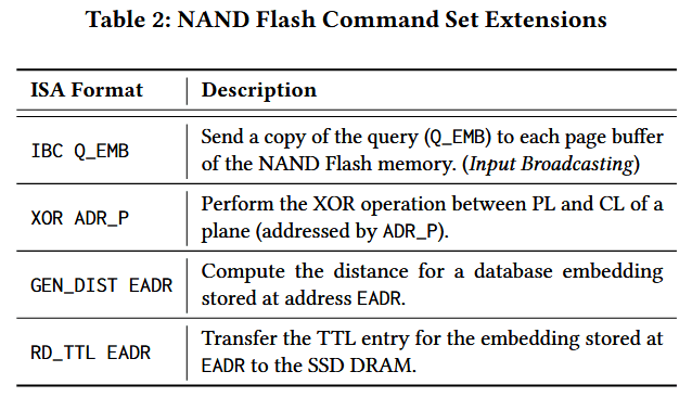 REIS 在 NAND 闪存芯片的控制逻辑中新增了指令,以支撑存储内 ANNS 引擎的检索操作。具体流程为:控制器先接收前述 API 指令,并将其转换为闪存命令;随后向闪存芯片发送这些命令,触发相应操作。每个闪存芯片内的控制逻辑是一个有限状态机,负责接收命令并控制闪存阵列的外围逻辑执行操作。表 2 详细描述了为数据库检索新增的 NAND 闪存命令集扩展。