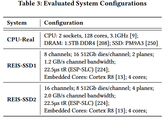 我们基于两款商用 SSD 产品(Samsung PM9A3 与 Micron 9400 ),在 REIS-SSD1 与 REIS-SSD2 两种 SSD 配置下评估 REIS—— 这两款 SSD 分别侧重低成本与高性能。文档检索的基准系统采用高端服务器,配备 AMD EPYC 9554 CPU与 Samsung PM9A3 SSD 。表 3 列出了 SSD 与基准 CPU 系统(CPU-Real)的参数。