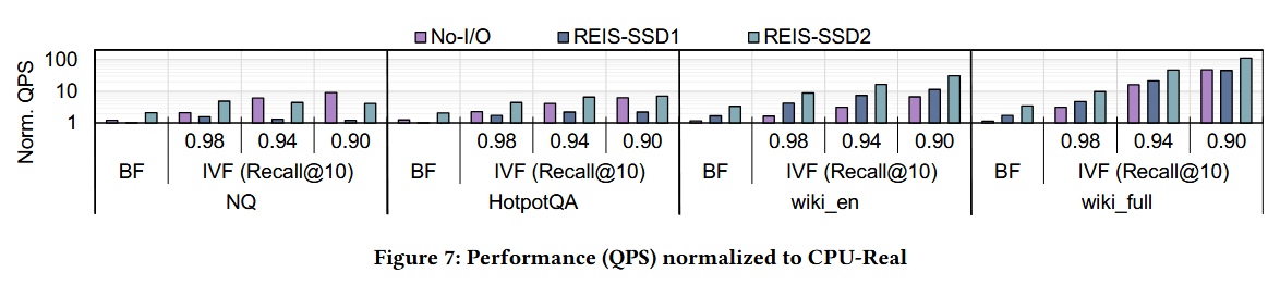 为凸显数据库布局与存储内处理(In-Storage Processing)带来的性能提升,我们首先基于暴力搜索(BF)对比 REIS 与 CPU-Real;随后在近似最近邻搜索场景下对比两者。我们使用 FAISS 库提供的 BQ 量化与重排序方案,在 IVF 算法下评估 REIS 与 CPU-Real,并将 IVF 的 Recall@10 精度从 0.98 调整至 0.9。
