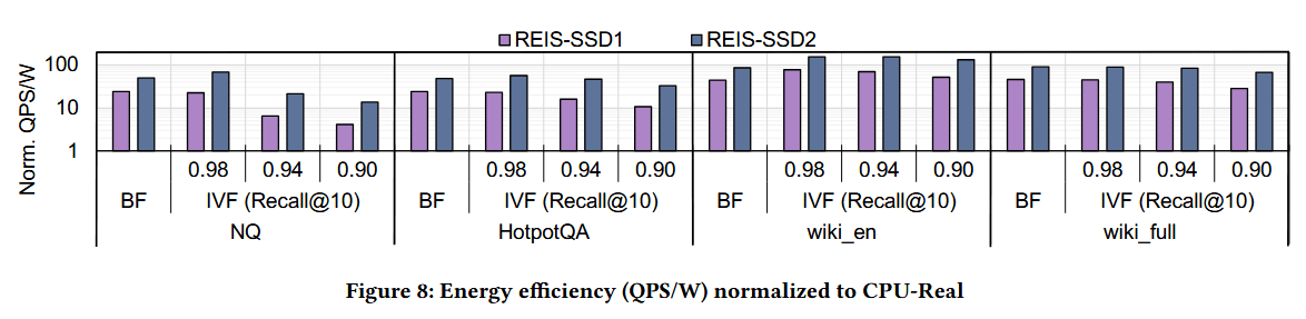 图 8 展示 REIS 的能效表现(QPS/W,每瓦每秒查询数),结果均归一化至 CPU-Real 的能效水平。我们得出两项关键结论:其一,REIS-SSD1 和 REIS-SSD2 相较 CPU-Real,能效平均提升55 倍,最高达157 倍;该能效提升的核心原因是,SSD 的功耗相较 CPU 基准系统平均降低29.7 倍。其二,REIS-SSD2 相较 REIS-SSD1,能效平均提升2.2 倍,最高达2.6 倍;这一能效提升幅度与 REIS-SSD2 相对 REIS-SSD1 的性能提升幅度相近,表明 REIS-SSD2 的能效增益主要源于其设计带来的更高吞吐量。