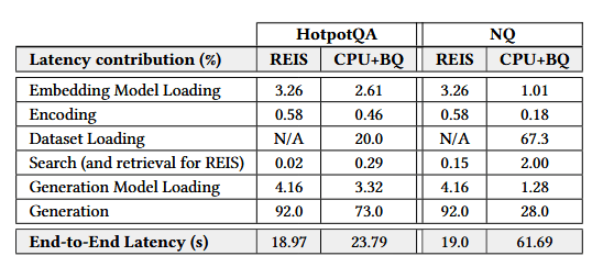 表 4 拆解了 REIS-SSD1 与基于 CPU 的二进制量化系统上,RAG 流水线各阶段的时延分布。其中数据集采用 HotpotQA 与 wiki_en。