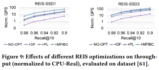 为开展敏感性分析,我们引入 No-OPT 作为基准配置:该 REIS 配置使用存储内 ANNS 引擎,但不启用距离过滤(DF)、流水线(PL)与多平面输入广播(MPIBC)。为单独量化 ANNS 带来的性能开销,我们基于 CPU 基准新增一个对比项 No-I/O:该配置消除了存储 I/O 数据移动带来的开销。此外,我们将 REIS 与两款最先进设计(NDSearch 与 ICE )对比 —— 两者分别采用图基与聚类基 ANNS 算法。必要时我们会调整实验方法以确保公平性。