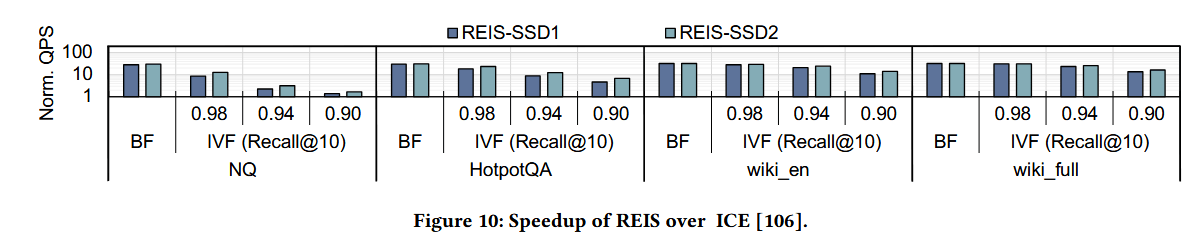 图 10 展示了 REIS 相对 ICE的性能提升倍数,ICE 是面向向量相似度检索的当前最优 ISP 方案。在暴力搜索(BF)模式下,REIS 在所有配置下的性能提升均超过 10 倍;在 IVF 模式下,性能提升倍数随召回率的升高而增大,体现出相较于 ICE 的性能优势。具体而言,在 SSD-2 配置下的所有数据集上,当 Recall@10 为 0.90 时,REIS 性能平均优于 ICE7.1 倍,Recall@10 为 0.98 时,这一数值达 22.9 倍。