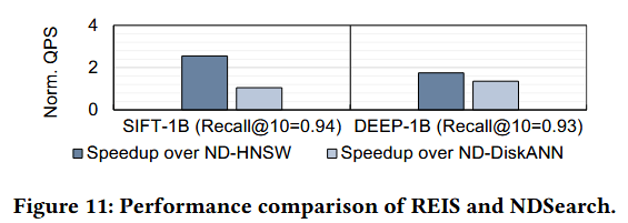 图 11 对比了采用 IVF的 REIS,与采用 HNSW和 DiskANN的 NDSearch 的性能表现。本次对比采用两个十亿级数据集 SIFT-1B 与 DEEP-1B,对应的 Recall@10 分别为 0.94 和 0.93。我们将 REIS 的吞吐量归一化至采用 HNSW 和 DiskANN 的 NDSearch 吞吐量水平,结果显示 REIS 性能平均优于 NDSearch1.7 倍,最高达 2.6 倍。