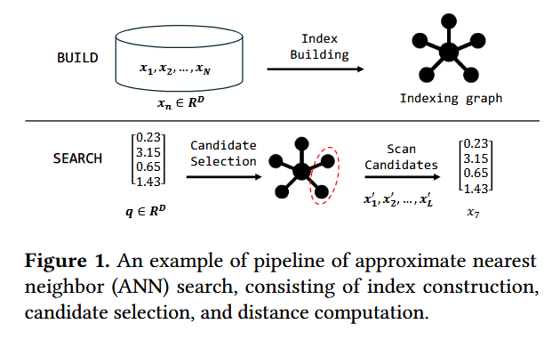 图 1 展示了典型的基于图的 ANN 搜索流程,它包含两个阶段:索引构建和查询处理。在构建阶段,系统根据一组数据向量 {x1,x2,…,xN}⊂RD的几何特性,构建一个基于邻近性的索引(例如图)。每个向量被表示为一个节点,并在根据选定距离度量判定为相近的向量对之间建立边。在搜索阶段,给定一个查询向量 q∈RD,系统首先通过遍历索引进行候选节点选择,随后根据距离对候选节点进行扫描和排序。最终结果返回排名靠前的候选节点,它们即代表了该查询向量的近似最近邻。