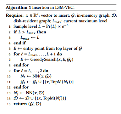 图 3 展示了 LSM-VEC 底层插入过程的一个运行示例。在此例中,新向量vn被插入到磁盘驻留图中。通过基于磁盘的最近邻搜索,LSM-VEC 识别出v4和v5是vn的前M个最近邻。随后,系统在vn与这两个节点之间建立双向链接。如该图下半部分所示,这些边被编码为键值对并插入 LSM-tree,其中键(key)代表源向量 ID,值(value)代表其邻居。所有插入操作最初都缓存在内存中,最终通过合并(compaction)传播到更深层的 LSM-tree 层级。该示例说明了 LSM-VEC 如何以较低开销将新向量整合进磁盘驻留索引中。完整的插入过程详见算法 1,其中NN(⋅)表示在内存图或磁盘驻留索引上进行的最近邻搜索。
