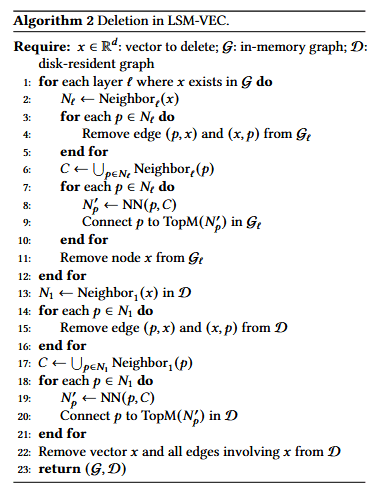 LSM-VEC 中的删除操作。为了支持动态向量数据库中的高效删除,LSM-VEC针对内存驻留层和磁盘驻留层均采用了一种局部邻居重连(neighbor relinking)策略。当一个向量被删除时,其直接邻居会通过近似邻居搜索进行重新连接,以维持局部图的连通性。针对磁盘层,LSM-VEC 会识别受影响的节点并将新边插入 AsterDB 中,从而避免了全量重新索引。