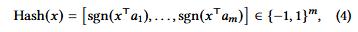 ,其中d为向量维度。每个数据向量x∈Rd都会被编码为一个二进制符号哈希码(binary sign-hash code):