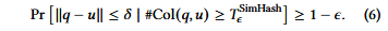 为了确保召回率保证,系统根据霍夫丁不等式(Hoeffding’s inequality)设定了一个冲突阈值。给定目标误差ϵ和最大距离δ,冲突次数的阈值被定义为 $T^{SimHash}_ϵ$ 。在这里δ通常对应于查询向量q与当前前k个候选集中最远候选者之间的距离,作为评估新候选者的动态截断值(dynamic cutoff)。