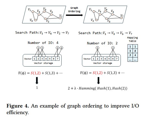 其中 $v_i = ϕ^{-1}(i)$ 表示存储布局中放置在位置i的节点。直观而言,这一目标促使频繁被共同访问的节点被紧密放置在一起,以便它们可以在同一个磁盘 I/O 块中被一并读取。