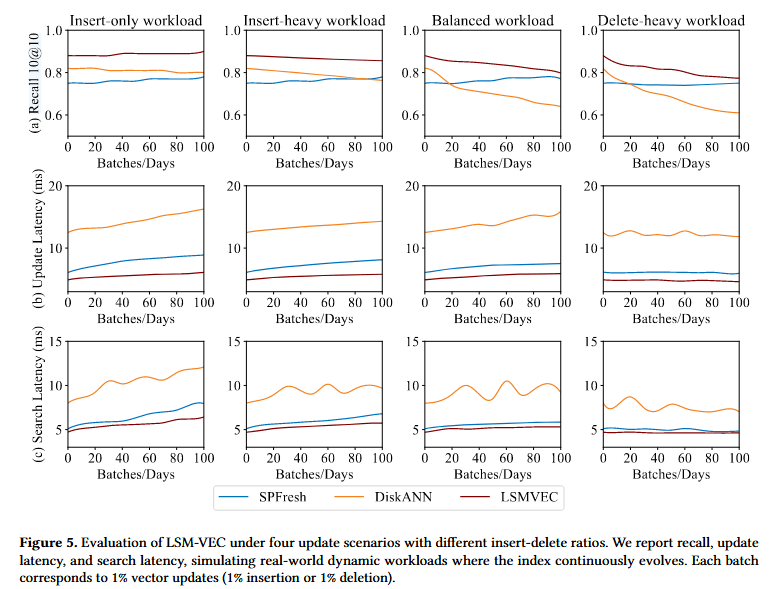 图 5 展示了这些实验的综合结果,报告了不同更新负载下的 Recall 10@10、更新延迟和搜索延迟。每个批次对应 1% 的向量更新(1% 插入或 1% 删除)。