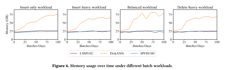 在仅插入负载中,DiskANN 的内存从 25GB 迅速增长到 76GB,因为所有插入的节点和图结构必须保存在内存中。相比之下,SPFresh 和 LSM-VEC 在整个运行过程中内存使用保持稳定。具体而言,LSM-VEC 从 22.4GB 增至 26.5GB,受益于紧凑的上层存储和磁盘驻留的底层图结构。即使在 100% 插入操作下,LSM-VEC 的内存曲线也保持平稳。在删除密集型负载下,LSM-VEC 同样表现出极佳的稳定性(22.4GB - 25.7GB)。相比之下,DiskANN 在动态场景中会出现严重的内存放大。这使得 LSM-VEC 特别适用于资源受限的环境。
