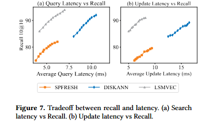 因此,SPFresh 以牺牲精度为代价换取了更新速度。与基于图的系统相比,其召回率较低,这使得它不太适用于那些对高精度和自适应索引有极高要求的工作负载。相比之下,我们的方法将邻近图的高召回率遍历特性与针对更新及磁盘效率优化的机制相结合,实现了可扩展的动态搜索。