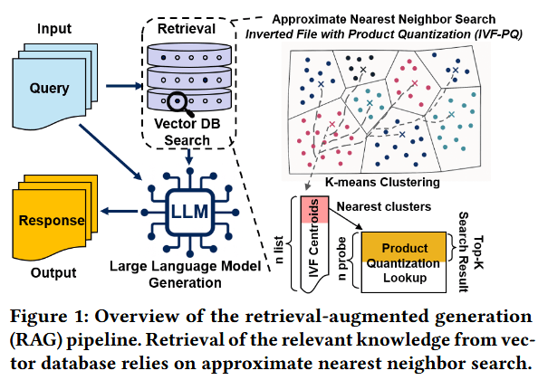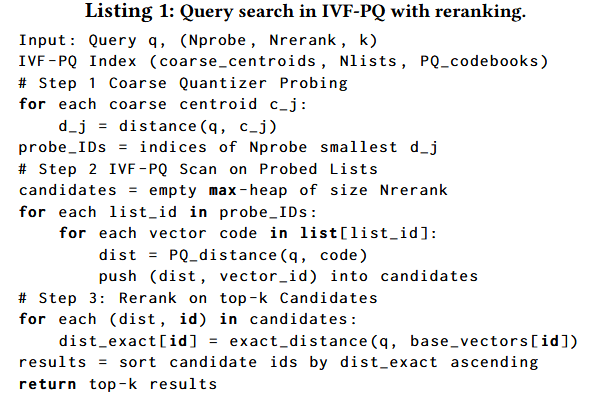 IVF-PQ 搜索。在本研究中,我们重点关注广泛使用的 IVF-PQ(倒排文件乘积量化) 索引技术,它在大规模近似最近邻搜索(ANNS)中实现了搜索速度与内存效率之间的良好平衡。如图 1 所示,IVF-PQ 能够自然地集成到基于大语言模型(LLM)的检索增强生成(RAG)流水线中。在离线索引构建期间,IVF 采用 k-means 算法将向量空间划分为 $N_{list}$ 个粗聚类,而乘积量化(PQ)则进一步将每个聚类内的残差向量压缩为短编码。这种结合使得在内存中存储数十亿个向量成为可能,同时保持了极具竞争力的检索准确性。在查询时,IVF-PQ 执行三个主要步骤(如代码段 1 所示):1) 粗量化器探测;2) 对所选倒排列表进行近似 IVF-PQ 扫描;3) 使用更高精度的距离对候选的 Top-k 结果进行重排。