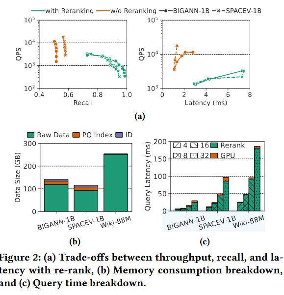 挑战 3:过长的重排延迟。如图 2(c) 所示,重排占据了查询时间的主要部分,因为全精度向量必须通过 PCIe 总线从 DRAM 或 SSD 中获取,这引入了巨大的延迟。这种开销在十亿级规模下会进一步增长,尤其是在处理大批量数据时。由于原始向量消耗了大部分内存空间(图 2(b)),它们无法驻留在 GPU 内,导致跨设备的数据访问不可避免,使得重排性能从根本上受限于内存容量和跨设备的数据移动。
