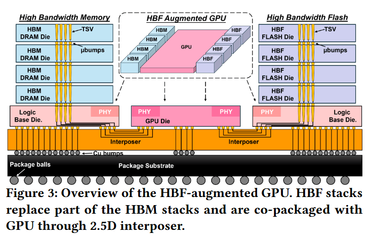 为了克服这一容量瓶颈,新兴的研究和行业路线图提出了高带宽闪存(HBF),这是一种以类似于 HBM 的方式集成的堆叠芯片 NAND 闪存。HBF 每个堆栈中提供高出 8-16 倍的容量,同时通过大规模并行 3D NAND 子阵列保持数百 GB/s 的读取带宽。这些特性使得 HBF 成为读密集型工作负载中 GPU 封装内存极具吸引力的候选方案。
