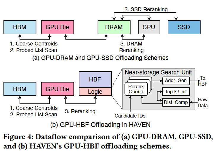 数据流 (Dataflow)。如图 3 所示,HAVEN 通过将 HBF 与 GPU 核心及 HBM 共同封装,采用了一种高效的数据通路。IVF-PQ 的前两个阶段(粗聚类中心探测和 IVF-PQ 列表扫描)保留在 GPU 和 HBM 上,以维持低延迟处理;而最后阶段——存储密集型的重排(reranking)——则被卸载到具有近存储处理(NSP)能力的 HBF 中。与基于 DRAM 或 SSD 的系统相比,这种设计显著降低了重排延迟。图 4 突出了其中的差异:在传统设计中(图 4(a)),全精度向量必须从 CPU 内存或 SSD 中获取,从而产生昂贵的 DDR 或 PCIe 传输开销。相比之下,HAVEN 的 GPU-HBF 数据流(图 4(b))将重排过程完全保留在封装内,消除了片外往返传输,并充分利用了 HBF 极高的内部带宽和并行性。