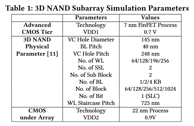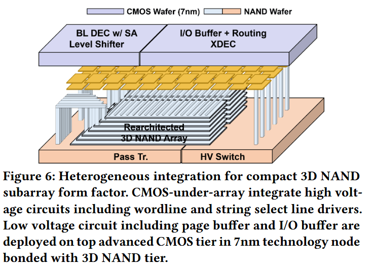 分布式子阵列建模。我们评估了将 3D NAND 分布到大量小尺寸子阵列中的架构权衡。在这种架构中,每个子阵列都配有独立的局部字线/位线驱动器和感测放大器,从而能够实现比传统 NAND 组织更高的内部并行度。此外,我们还引入了异构集成(heterogeneous integration),以进一步提高存储密度并提升性能,如图 6 所示。