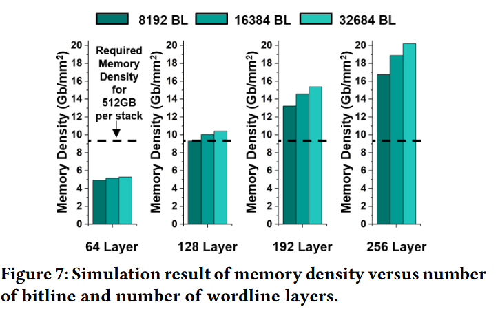 为了量化这种重构的影响,我们采用了一个基于 3D-FPIM 并结合 NeuroSim(用于缩放外围电路)的分布式 3D NAND 子阵列建模框架。这种组合能够实现从阵列级到芯片级的投射,涵盖 3D 堆叠层数、页大小(page size)和块大小(block size)等子阵列粒度参数。详细的 3D NAND 参数列于表 1 中。利用该仿真框架,我们首先扫描了 3D 堆叠中的字线(WL)层数,并评估了密度扩展趋势,如图 7 所示。分析表明,要在 8 层堆叠(8-Hi stack)中实现 512 GB 的容量,至少需要 128 层字线。为了给更多的向量数据库留出设计余量,并与最先进的 NAND 技术路线图保持一致,我们采用 256 层字线作为后续所有 HBF 建模的基准技术节点。
