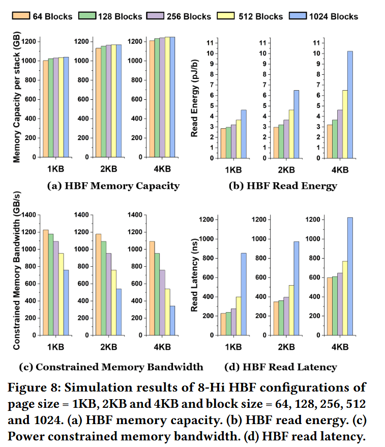 由于采用了细粒度的并行分布式子阵列架构,HBF 的带宽从根本上受限于供电功率。为了保持与 HBM 相当的热约束和封装约束,我们为每个堆栈(Stack)设定了类似 HBM 的 $30\text{ W}$ 功率包络。基于此约束,我们通过遍历不同的页面尺寸和块数量来评估可持续的读取带宽,结果如图 8(c) 所示。随着页面增大和块数增多导致容量提升,单次访问所需的功率随之增加,并最终限制了有效吞吐量。当块数量超过 128 时,由此产生的带宽退化尤为严重。为兼容 HBM2E 基础设施,我们设定每个堆栈的最大带宽为 $460\text{ GB/s}$。