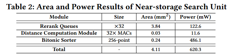 HAVEN 与 HBF 仿真。我们结合 3D-FPIM 和 NeuroSim 对重构后的 3D NAND 子阵列进行了仿真。其功耗模型经过工业级性能数据的校准(参考文献:1)。ASIC 近存储搜索单元采用 Verilog HDL 实现,并在 22 nm 技术节点下进行综合。该搜索单元的内核频率达到 1 GHz。表 2 总结了近存储搜索单元的面积和功耗结果:总占用面积为 4.11 mm²,功耗为 620.3 mW;其中重排队列(rerank queues)占据了主要面积,而双调排序器(Bitonic sorter)则是功耗的主要来源。