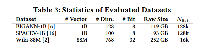 数据集 (Datasets)。我们在三个涵盖不同领域的大规模向量数据集上对 HAVEN 进行了评估。BIGANN-1B 和 SPACEV-1B 是两个十亿规模的数据集,向量维度分别为 128 维和 100 维。Wiki-88M 提供了 8800 万个高维(768 维)嵌入向量,具有典型的大语言模型(LLM)检索负载特征。表 3 总结了这些数据集的关键统计信息。