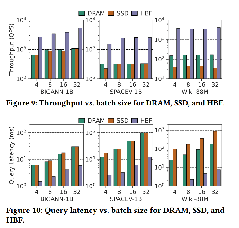 吞吐量 (Throughput)。图 9 展示了 DRAM、SSD 和 HBF 在不同批处理大小(batch sizes)下的吞吐量。HBF 在所有数据集上均实现了最高的 QPS(每秒查询数),并随批处理大小的增加平稳扩展;而 DRAM 和 SSD 则因数据移动瓶颈迅速达到饱和。在 BIGANN-1B 和 SPACEV-1B 数据集上,HBF 的吞吐量高出约 3-8 倍;在重排数据流量更大的高维数据集 Wiki-88M 上,其优势更是扩大到 20 倍以上。