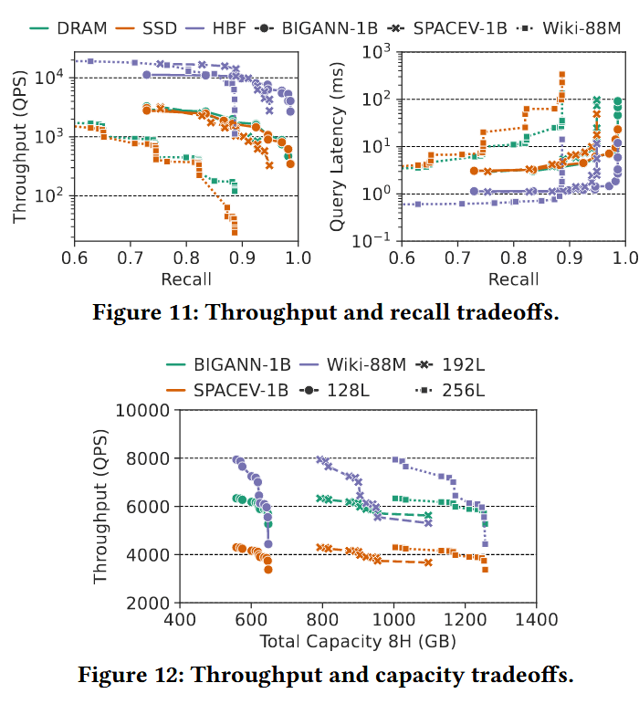 吞吐量与召回率的权衡 (Throughput and Recall Tradeoffs)。图 11 展示了吞吐量与召回率之间的权衡关系。HBF 始终在帕累托前沿(Pareto-dominates)优于 DRAM 和 SSD,在给定召回率下能维持更高的 QPS,在给定 QPS 下能实现更高的召回率。在高召回率(≥ 0.9)阶段,这种优势进一步扩大,因为不断增长的重排流量会导致 DRAM/SSD 因片外传输而承受剧烈的吞吐量下降和延迟惩罚。通过将重排保留在封装内,即使召回率目标更加严苛,HBF 也能同时保持高吞吐量和低延迟。