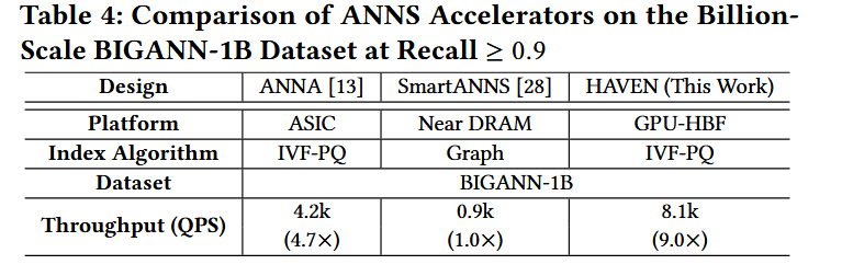 与其他加速器的比较 (Comparison with Other Accelerators)。表 4 将 HAVEN 与两种最先进的 ANNS 加速器在十亿级 BIGANN-1B 数据集(召回率 ≥ 0.9)上进行了对比。ANNA 是一种使用 16 字节 PQ 编码的 IVF-PQ ASIC 加速器,而 SmartANNS 是部署在 12 个 SmartSSD 上的基于图(graph-based)的系统。HAVEN 实现了 8.1k 的 QPS,分别比 ANNA 和 SmartANNS 快 1.9 倍和 9 倍。通过将封装内 HBF 存储与近存储重排集成,HAVEN 充分利用了极高的内部带宽并消除了片外瓶颈,使其性能超越了专用 ASIC 方案和基于 SmartSSD 的加速器。
