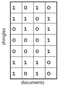 一个例子见下图,对于一段文本,我们将其shingling成集合shingle set后,对照词表vocab进行one-hot编码,由于shingle set中包含"ly"这个shingle,故对应于vocab的one-hot编码的第一个位置就为1,同理,shingle set中包含"ti"这个shingle,故对应于vocab的one-hot编码的第一个位置就为1,以此类推,我们就得到一个很长的01向量,向量维度就是词表中shingle的个数