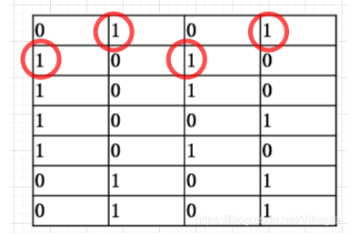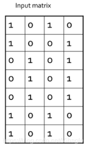 假设有4个文本,每个文本原来的布尔向量维度是7,且我们想通过MinHash将这个7维降为3维,那么MinHash的步骤如下:(下图展现的是原始的布尔向量矩阵,每一列代表一个文本)