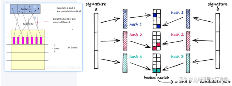 然后对每一组的所有列分别进行hash,映射到不同的桶中。对于两个列,只要任意一组能够hash到同一个桶中,那么这两个列就可以成为相似项