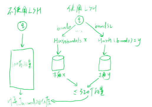 如下图所示,假设现在向量数据库中已经存储了100万个向量(哈希签名),如果不使用LSH,需要对一个查询向量计算100万次jaccard相似度,如果使用LSH:假设一个哈希签名有32个band,不同band拥有独立的桶空间,每个band有10万个桶,(平均一个桶中映射10个向量),则总共有320万个桶。此时,对一个查询向量的32个band各自会映射到一个桶中,平均可以取到320个向量(实际情况远低于320,因为每个band对应的桶中的向量id存在大量重复的),此时就只需要计算320次jaccard相似度。