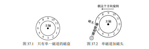 - 磁头(disk head):用于读写操作,连接到**磁盘臂(disk arm)**上,用于将磁头定位在期望的磁道上。