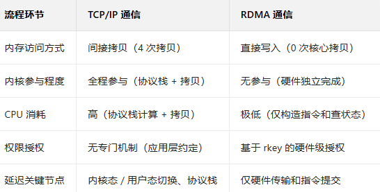 - 远程内存直接访问:通过内存注册和地址映射,本地应用可直接读写远端主机的内存区域,无需远端 CPU 参与数据拷贝